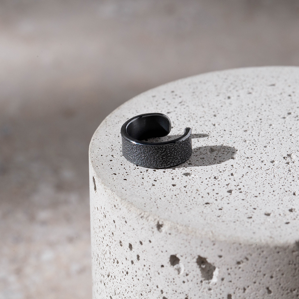因手工製作,每只角度與尺寸與表面氧化會有些微差異,氧化層也因配戴有不同磨光效果,更顯設計雕塑感