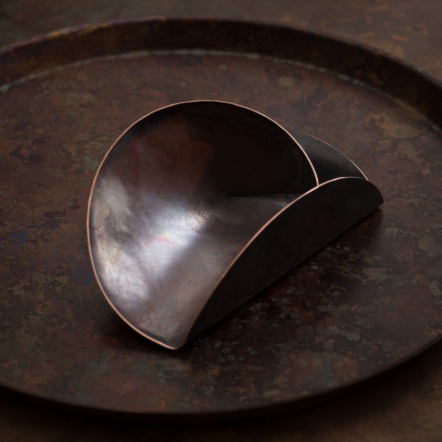 Defines the tea stage—gathers pot, cups, and tools while protecting the table. The flat surface showcases fire-born copper patina, inviting close appreciation of the metalcraft.
