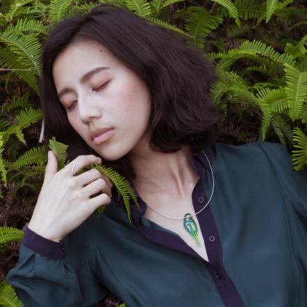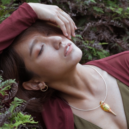 This necklace features a rigid arc inspired by Birds and Taiwan’s island shape. The pendant is subtly held like a bird’s beak—unbound, quiet, and strong.