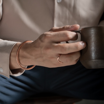 因手工製作,每只角度與尺寸與表面氧化會有些微差異,氧化層也因配戴有不同磨光效果,更顯設計雕塑感