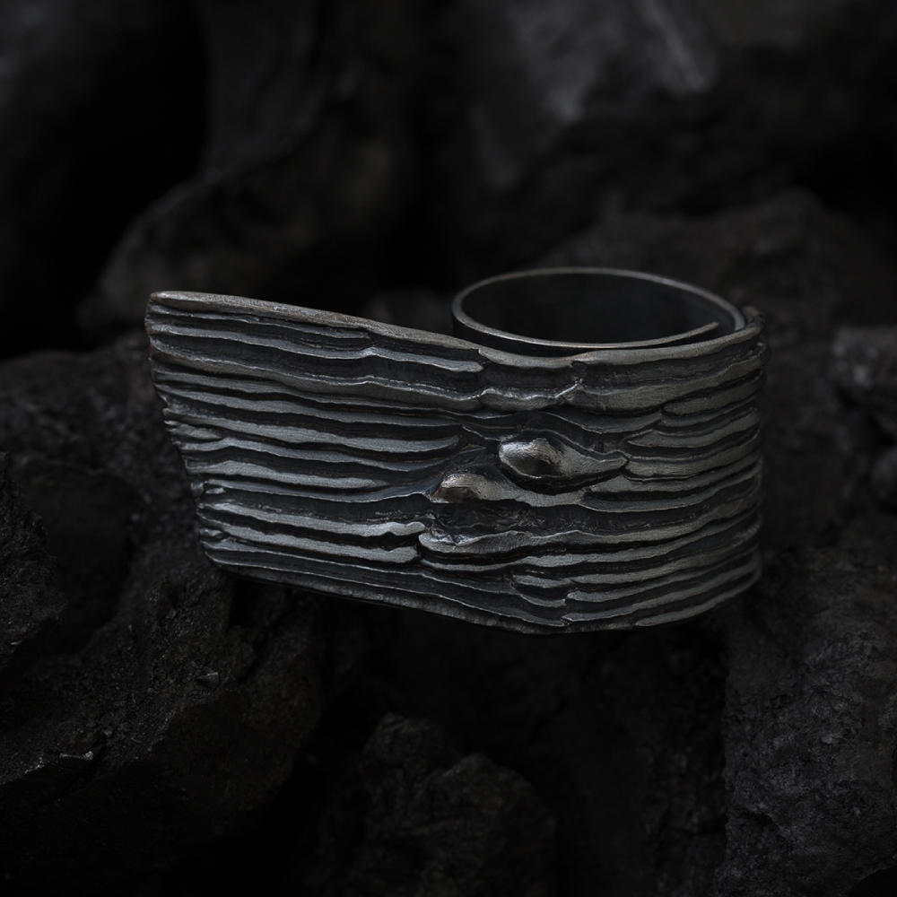 因手工製作,每只角度與尺寸與表面氧化會有些微差異,氧化層也因配戴有不同磨光效果,更顯設計雕塑感