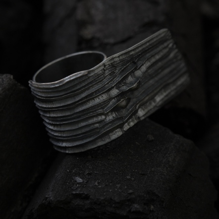 墨摺,起于在浸潤墨的筆刷與紙張中探索,把蒼勁的運筆,轉、折、頓、行、縱、挫,這些書寫藝術的筆觸在空間中運行的樣子,抽象的化作立體肌理摺理,長出筆墨線條書法之美的層層力量。 墨摺用當代的語言詮釋古典書法的筆墨內涵。 探討以金工首飾重現墨韻,呼應書法文字橫竪的結構;運筆的節奏;墨的顏色;書寫空間的餘白;濃濕墨痕的肌理,運用書法中的虛實相對、破除框架等筆法線條,與氧化銀的濃淡呈色、線性結構、凹凸肌理對照呼應,以時間文化與環境溫濕度的積累,創造出更多配戴的想像。