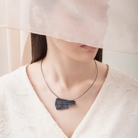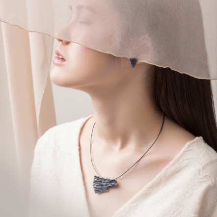 墨摺,起于在浸潤墨的筆刷與紙張中探索,把蒼勁的運筆,轉、折、頓、行、縱、挫,這些書寫藝術的筆觸在空間中運行的樣子,抽象的化作立體肌理摺理,長出筆墨線條書法之美的層層力量。 墨摺用當代的語言詮釋古典書法的筆墨內涵。 探討以金工首飾重現墨韻,呼應書法文字橫竪的結構;運筆的節奏;墨的顏色;書寫空間的餘白;濃濕墨痕的肌理,運用書法中的虛實相對、破除框架等筆法線條,與氧化銀的濃淡呈色、線性結構、凹凸肌理對照呼應,以時間文化與環境溫濕度的積累,創造出更多配戴的想像。
