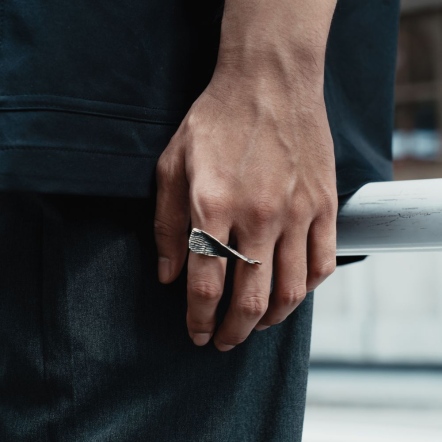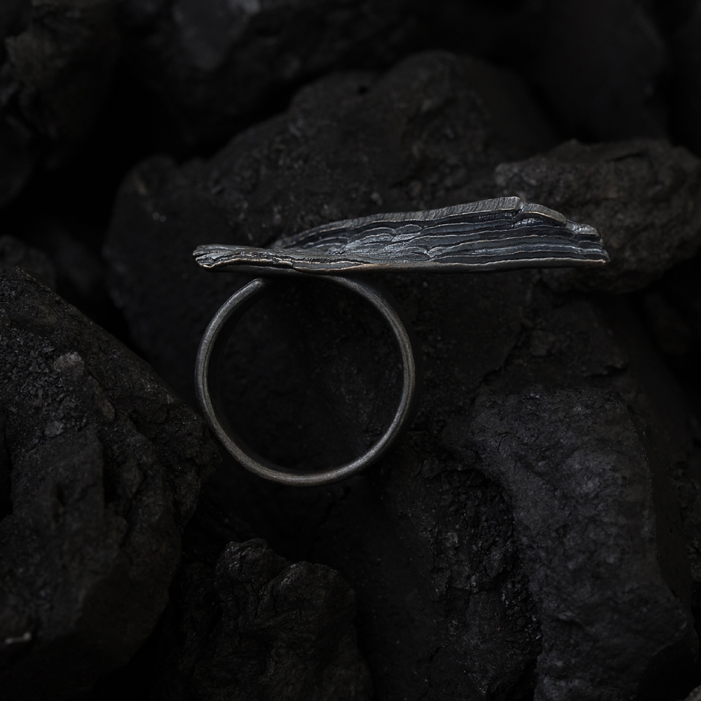Each piece is a living canvas. Oxidized silver matures over time, much like calligraphy ink shifting on paper. The deep tones, matte gradients, and spatial compositions mirror the contrast between black and white, fullness and void, presence and pause.