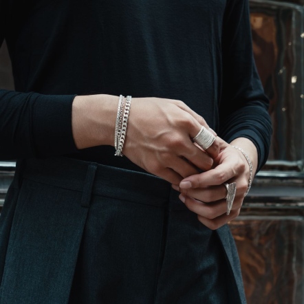 因手工製作,每只角度與尺寸與表面氧化會有些微差異,氧化層也因配戴有不同磨光效果,更顯設計雕塑感