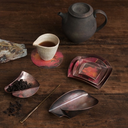 Defines the tea stage—gathers pot, cups, and tools while protecting the table. The flat surface showcases fire-born copper patina, inviting close appreciation of the metalcraft.