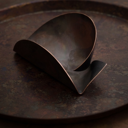 Defines the tea stage—gathers pot, cups, and tools while protecting the table. The flat surface showcases fire-born copper patina, inviting close appreciation of the metalcraft.