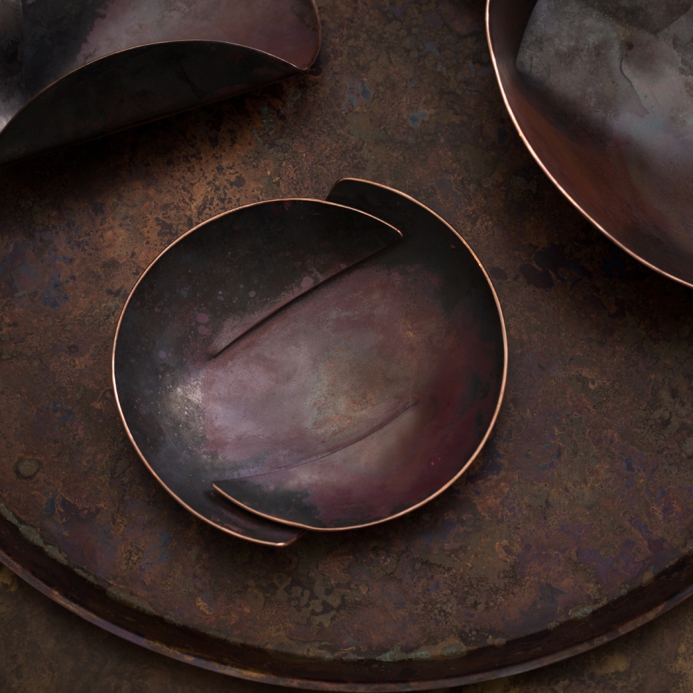 Defines the tea stage—gathers pot, cups, and tools while protecting the table. The flat surface showcases fire-born copper patina, inviting close appreciation of the metalcraft.