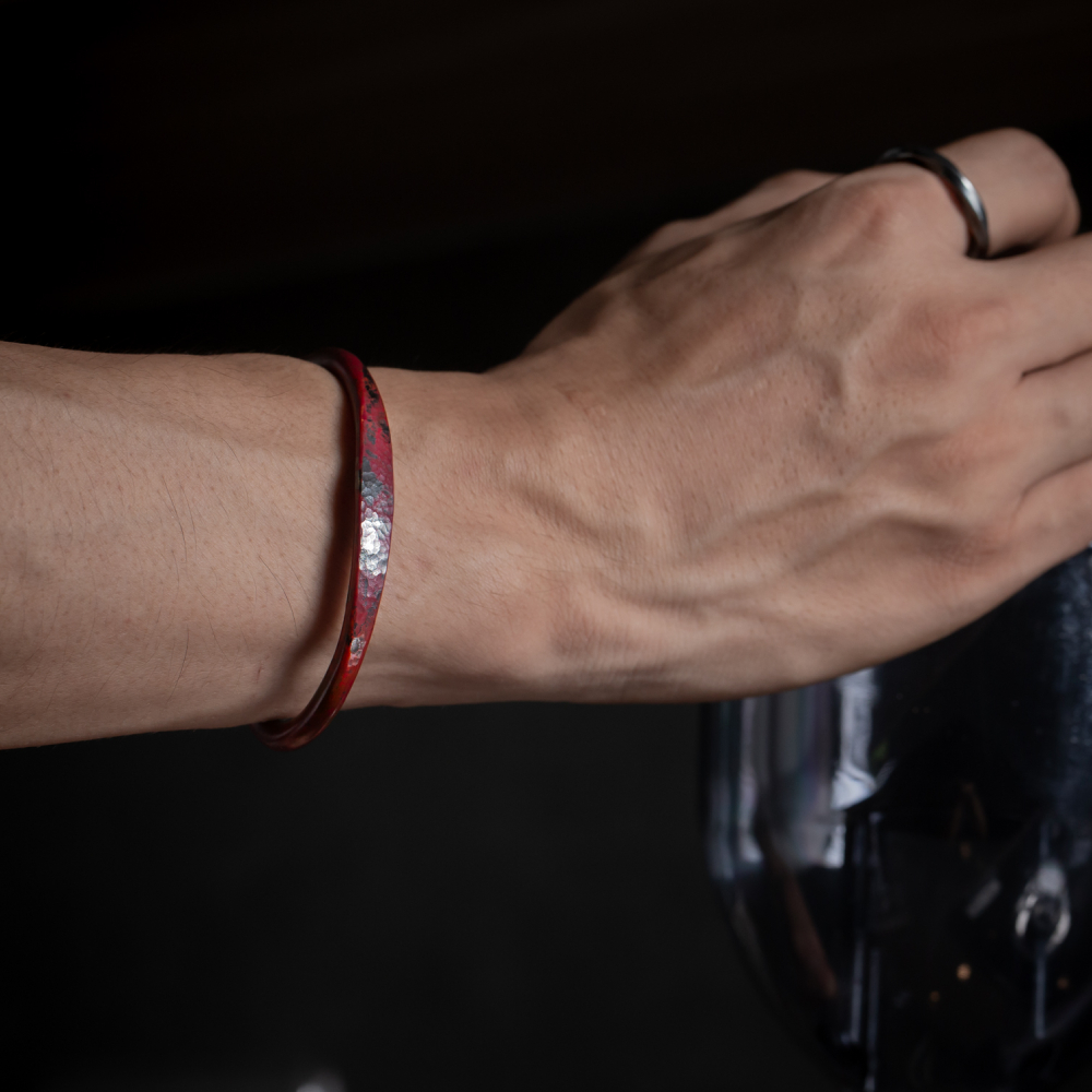 因手工製作,每只角度與尺寸與表面氧化會有些微差異,氧化層也因配戴有不同磨光效果,更顯設計雕塑感