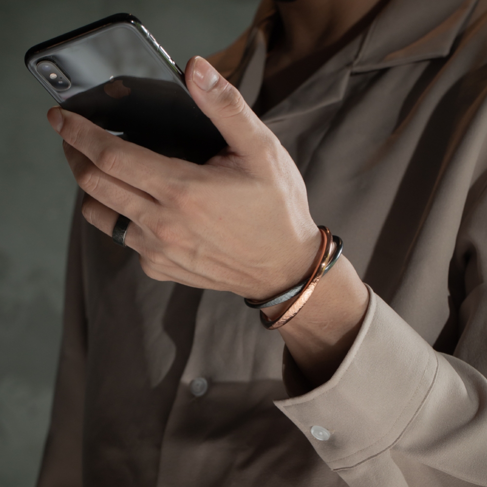 因手工製作,每只角度與尺寸與表面氧化會有些微差異,氧化層也因配戴有不同磨光效果,更顯設計雕塑感