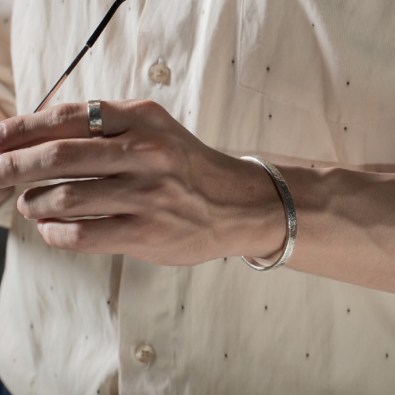 因手工製作,每只角度與尺寸與表面氧化會有些微差異,氧化層也因配戴有不同磨光效果,更顯設計雕塑感
