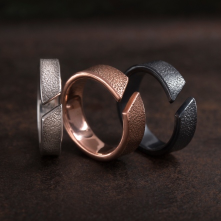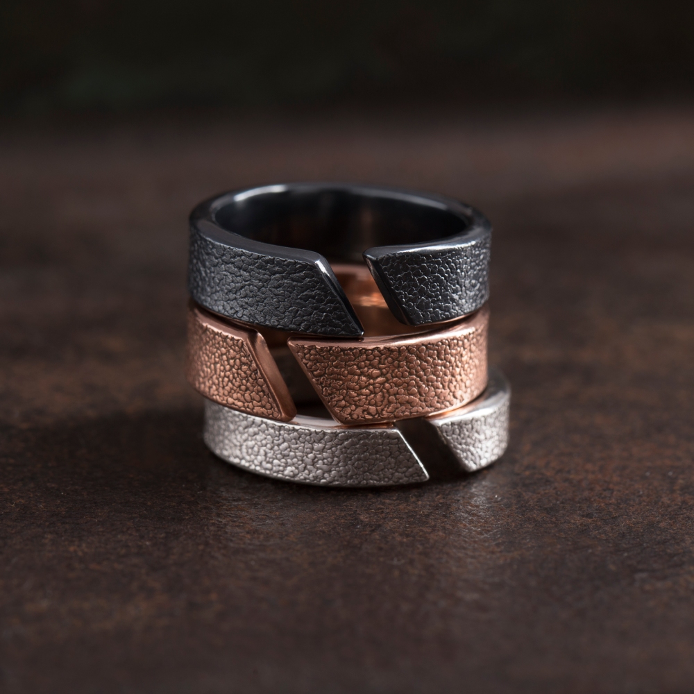 因手工製作,每只角度與尺寸與表面氧化會有些微差異,氧化層也因配戴有不同磨光效果,更顯設計雕塑感
