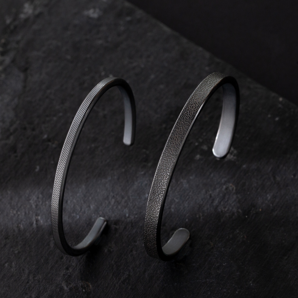 因手工製作,每只角度與尺寸與表面氧化會有些微差異,氧化層也因配戴有不同磨光效果,更顯設計雕塑感
