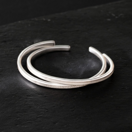 因手工製作,每只角度與尺寸與表面氧化會有些微差異,氧化層也因配戴有不同磨光效果,更顯設計雕塑感