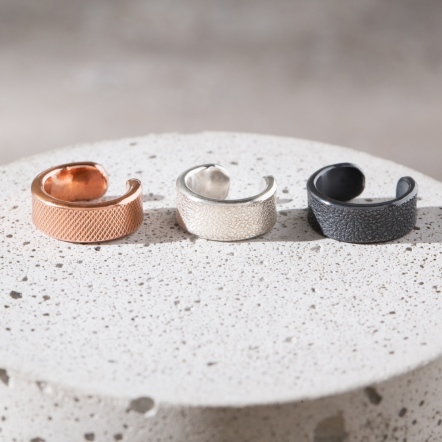 因手工製作,每只角度與尺寸與表面氧化會有些微差異,氧化層也因配戴有不同磨光效果,更顯設計雕塑感
