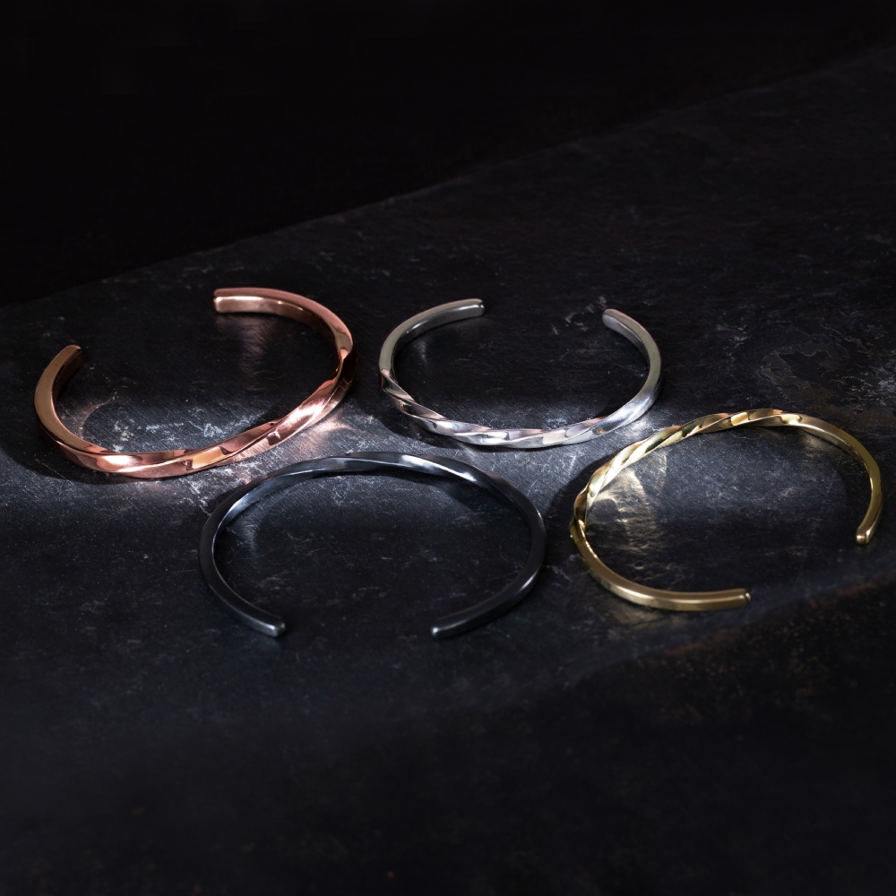 因手工製作,每只角度與尺寸與表面氧化會有些微差異,氧化層也因配戴有不同磨光效果,更顯設計雕塑感