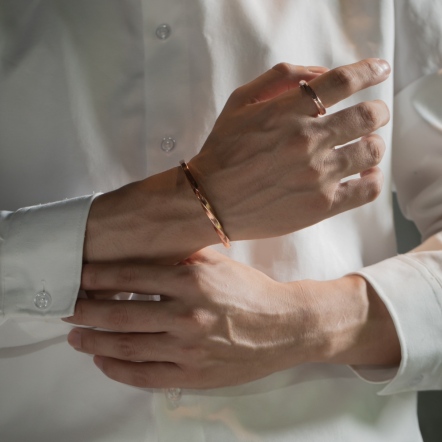因手工製作,每只角度與尺寸與表面氧化會有些微差異,氧化層也因配戴有不同磨光效果,更顯設計雕塑感