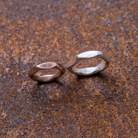 因手工製作,每只角度與尺寸與表面氧化會有些微差異,氧化層也因配戴有不同磨光效果,更顯設計雕塑感