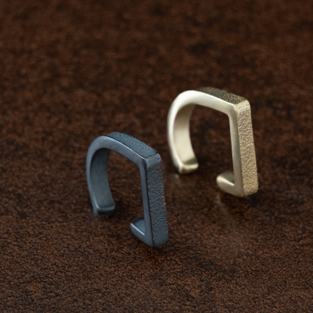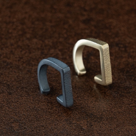 因手工製作,每只角度與尺寸與表面氧化會有些微差異,氧化層也因配戴有不同磨光效果,更顯設計雕塑感