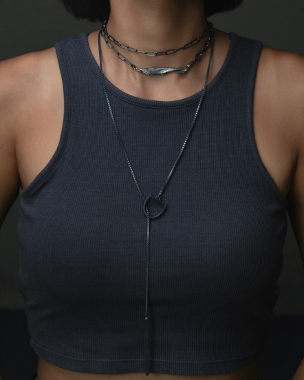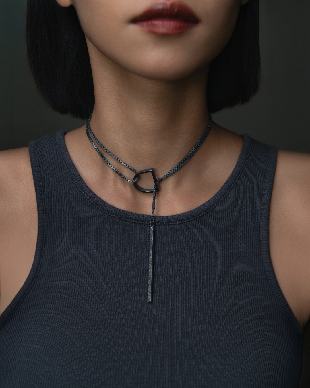 Designed for fluid styling, this Y-shaped necklace can be worn long, short, forward, or sideways. Order becomes freedom. The form mirrors our emblem: a circle with internal angles, expressing balance between flow and structure.