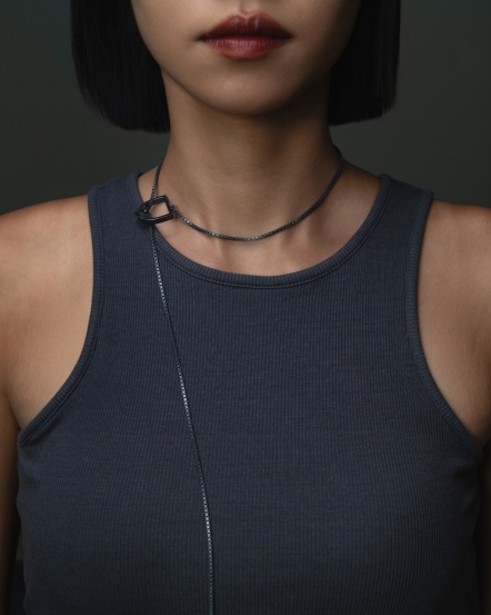 強調配戴方式的自由,無論長短、正側皆可靈活轉換,規矩中展現無拘的秩序。設計語彙來自品牌 LOGO,圓中帶方,象徵流動與結構的平衡。