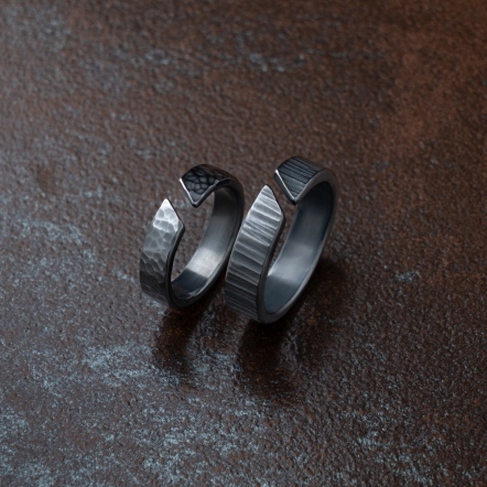 因手工製作,每只角度與尺寸與表面氧化會有些微差異,氧化層也因配戴有不同磨光效果,更顯設計雕塑感