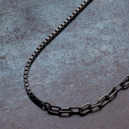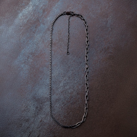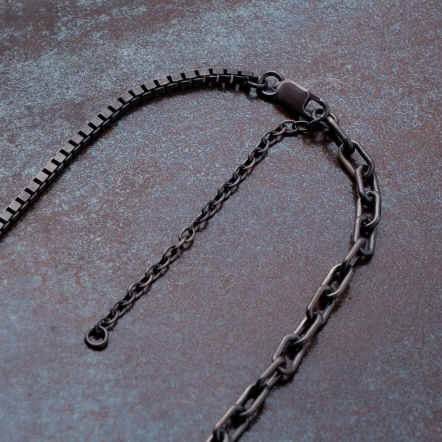 兩雙拼接的極簡鍊條象徵了這些風格的融合,而迷霧灰的做舊質感透過自然氧化呈現出歲月的痕跡,皆有兩種顏色:迷霧灰 / 星河銀 ,讓每款項鍊擁有深邃且神秘的氛圍。