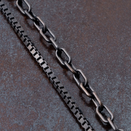 The dual minimalist chains symbolize the fusion of styles, while the oxidized mist-grey finish gives each piece a deep, timeworn character.