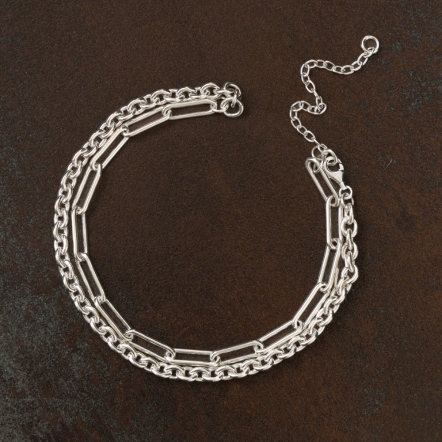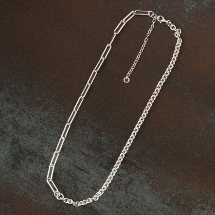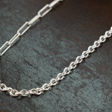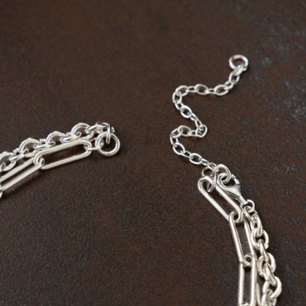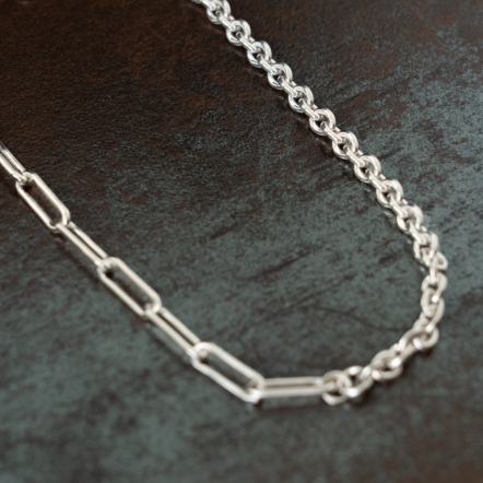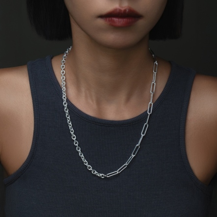 兩雙拼接的極簡鍊條象徵了這些風格的融合,而迷霧灰的做舊質感透過自然氧化呈現出歲月的痕跡,皆有兩種顏色:迷霧灰 / 星河銀 ,讓每款項鍊擁有深邃且神秘的氛圍。