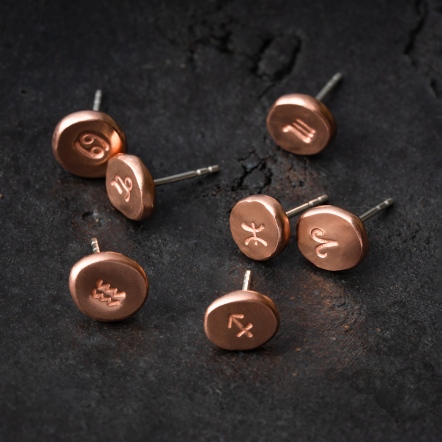 Crafted from recycled 999 silver with pure copper/brass, each piece is repeatedly fired and rolled, then steel-stamped with your zodiac sign onto a molten silver granule.