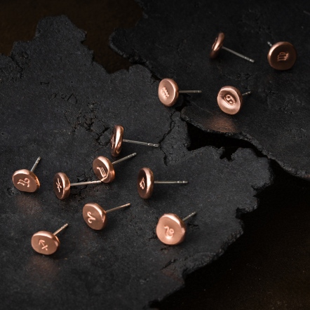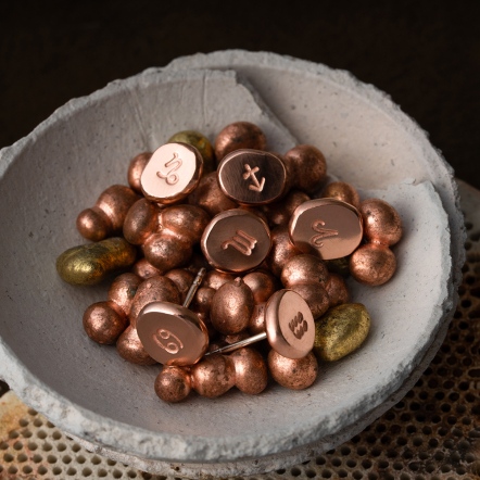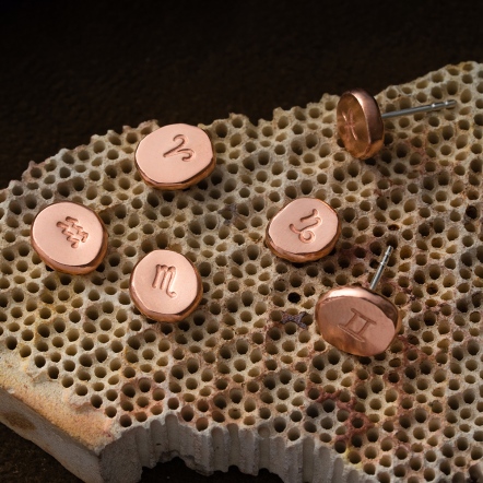 Crafted from recycled 999 silver with pure copper/brass, each piece is repeatedly fired and rolled, then steel-stamped with your zodiac sign onto a molten silver granule.